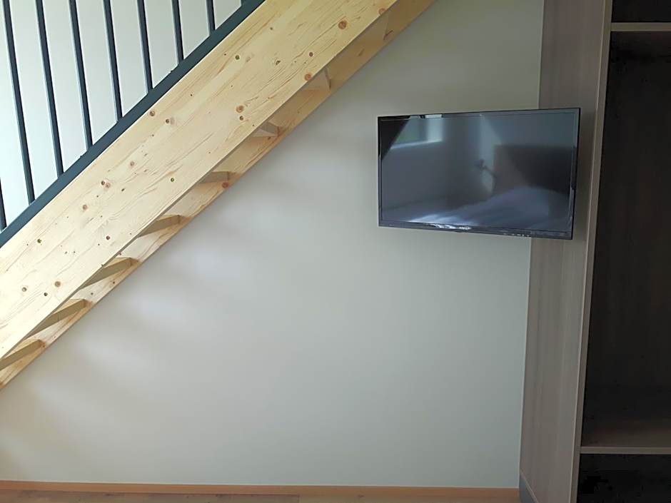 This family room is 1.5 floors with bedrooms on both levels. There is a flat-screen TV and private bathroom.